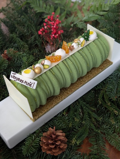 / Green Velvet Buche Black Sesame Mousse, Yuzu Cremeux and Citrus insert, Pistachio Sesame Pain de Gene and Paillete Feuilletine (size for 6 pax)